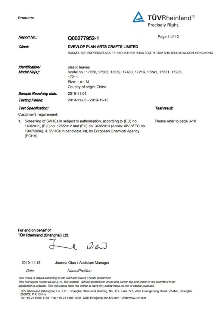 Engineered for both beauty and safety, FeelReal plants are not only lifelike but also UV resistant and fire retardant. They undergo rigorous testing to meet international standards and are certified by leading organizations such as ISO, RoHS, BSCI, CE, FSC, and SGS. This commitment ensures you receive durable, compliant, and high-quality products.