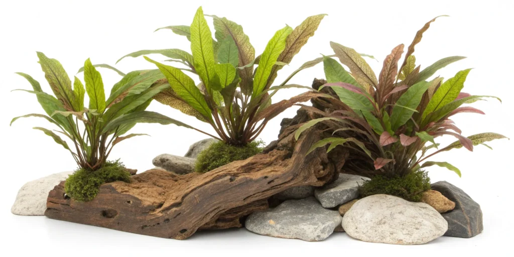 Weighted bases are essential for keeping plants anchored despite water flow or fish activity. Discreet bases made from resin or natural-looking stones keep plants in place without looking out of place. For tanks with active fish, just make sure to reinforce stability by lightly burying the base in the substrate or securing it to driftwood. Proper anchoring prevents floating plants and ensures your aquascape looks polished between cleanings.