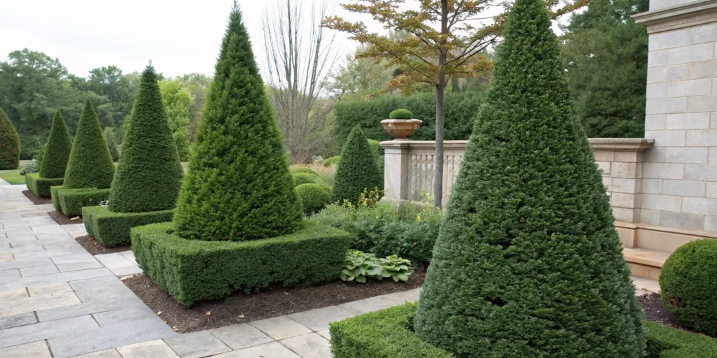 Pyramidal boxwood naturally forms cones 6–12 feet tall and 2–3 feet wide. It works for entrances, corners, and vertical accents with minimal maintenance.