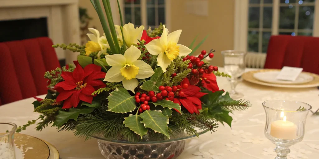 - Festive Centerpiece: Combine cut narcissus, holly and, to add a little more holiday cheer, cut stems of poinsettia (soaked in hot/cold water to extend life). This mixture forms a focal point of peace, goodwill and promise of renewal.