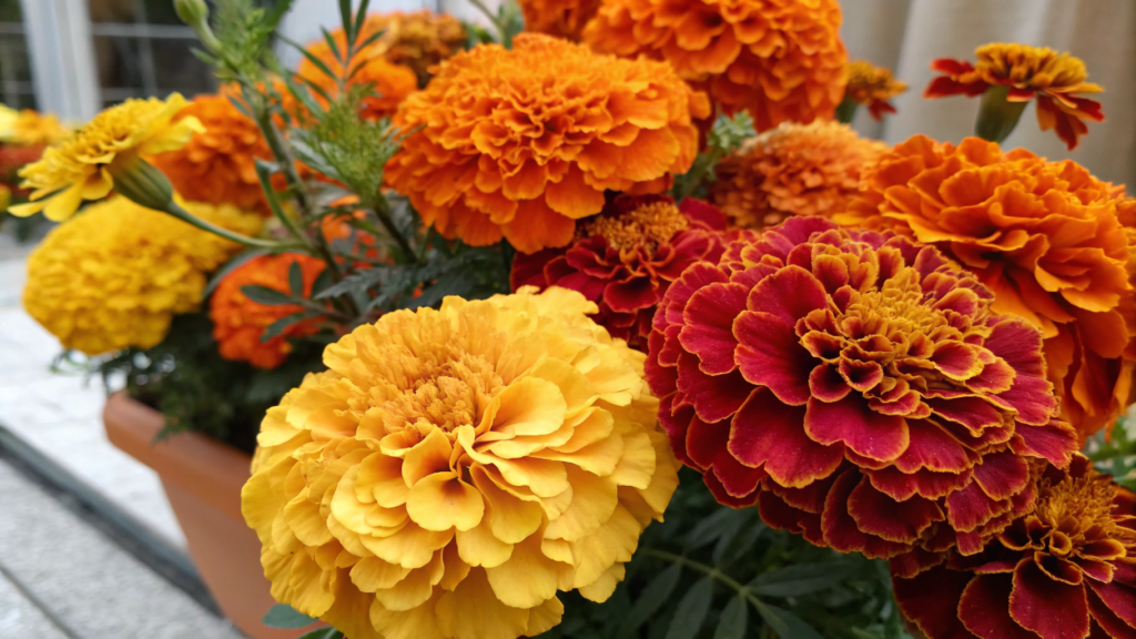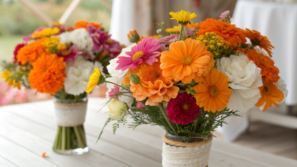 - Table Centerpieces: Cosmos mixed with artificial greenery form light centerpieces, and marigolds showcase fall colors.