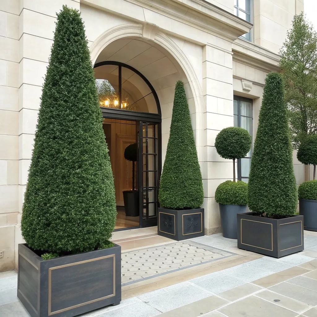 Hotels and Resorts: Create sophisticated entrances with potted pyramidal trees and spiral topiary.
